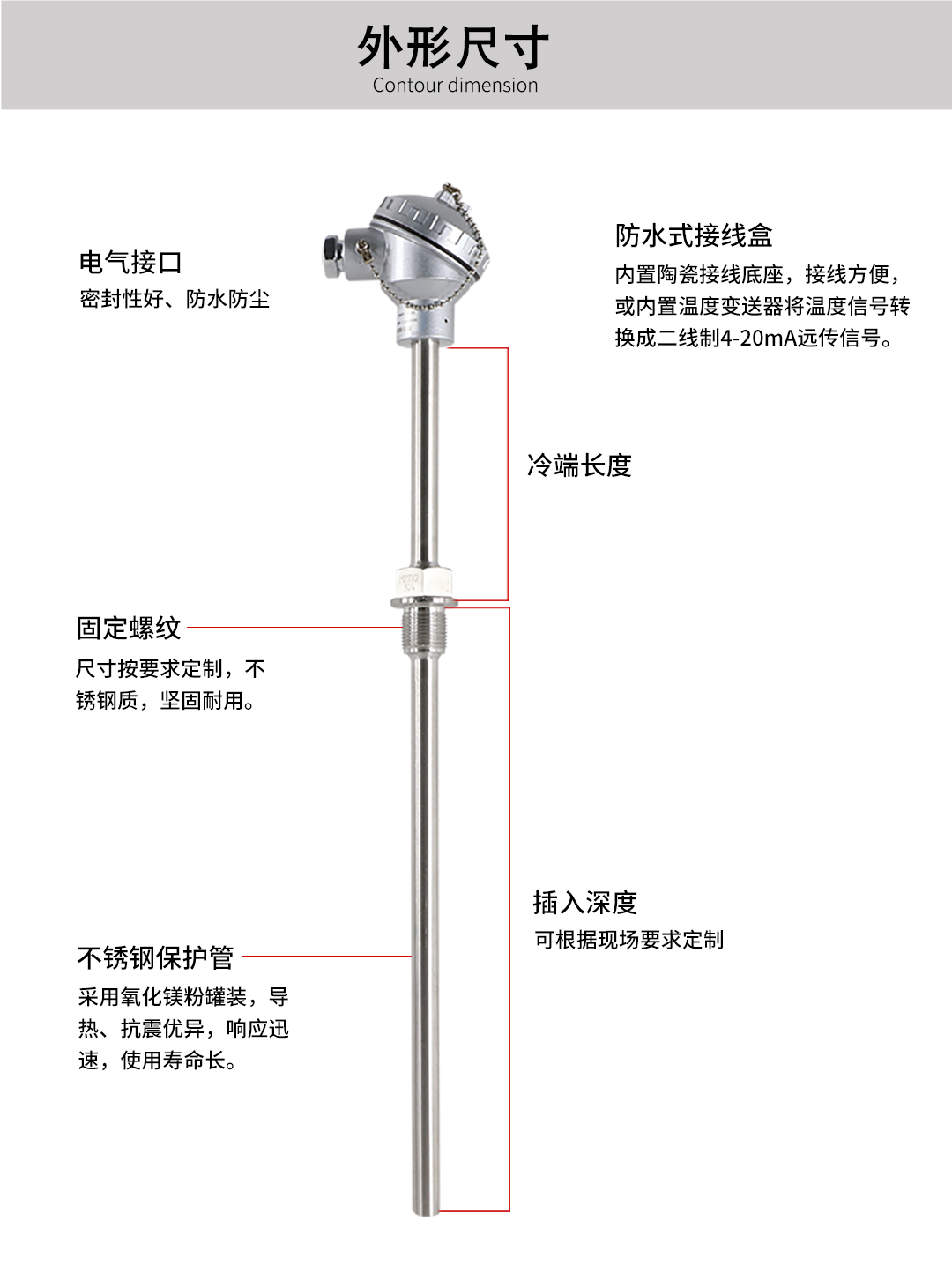 裝配式熱電阻熱電偶作為溫度測量傳感器,通常與溫度變送器、調節器及顯示儀表等配套使用,組成過程控制系統,用以直接測量或控制各種生產過程中流體、蒸汽和氣體介質以及固體表面等溫度。