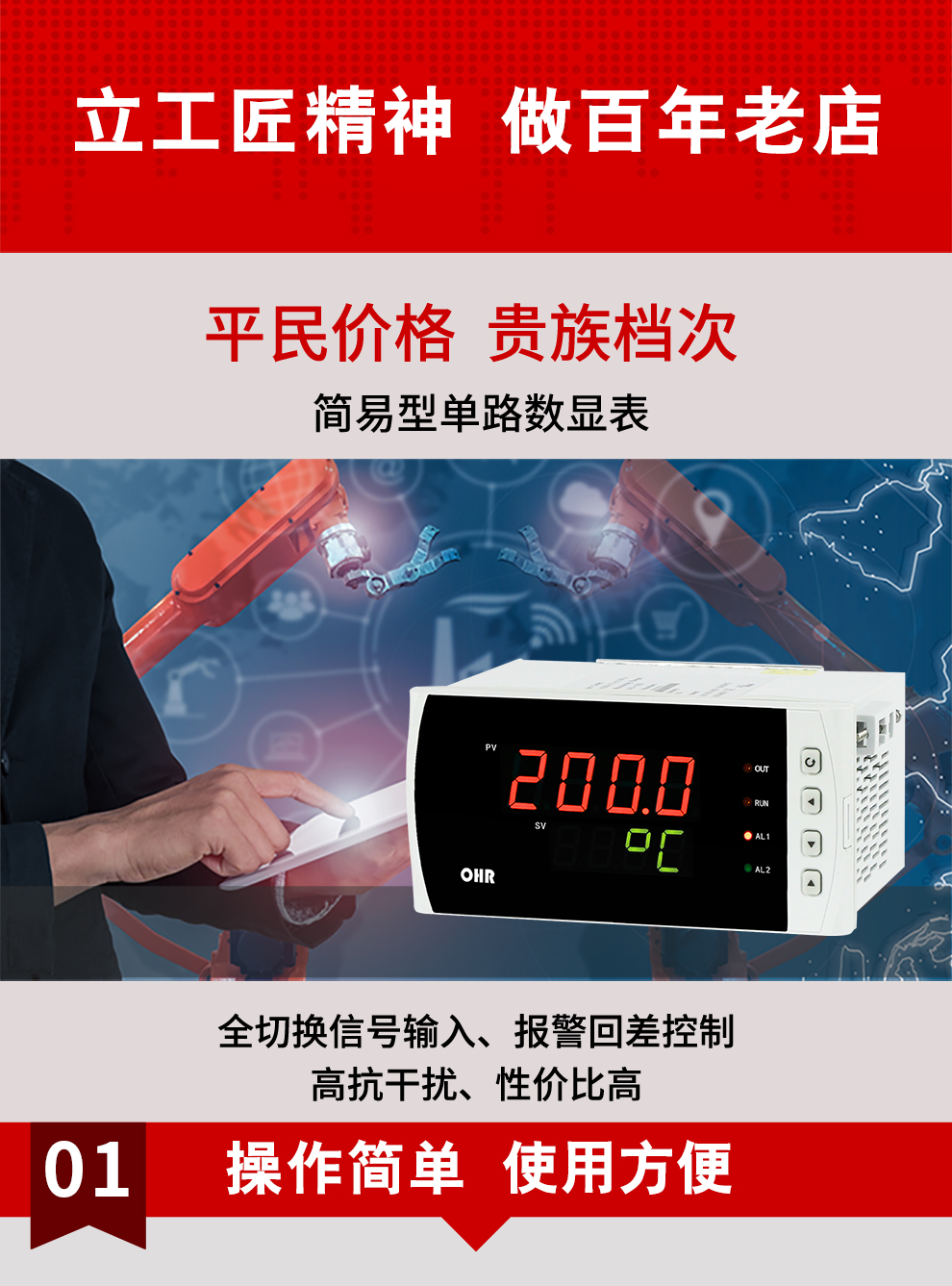 虹潤公司是專業生產數顯表的國家專精特新“小巨人”企業,生產的簡易型數字顯示控制儀,具有全切換信號輸入,多種外形尺寸,高抗干擾,輸入/輸出/電源三隔離,性價比高等特點。該產品不僅通過德國萊茵 CE 認證,還獲得巡回檢測顯示方法及裝置、儀表殼體等2項國家發明專利,主持起草工業過程控制系統用模擬輸入兩位或多位輸出儀表、物聯網智能溫度儀表通用技術條件等2項國家標準,以及通信系統多通道數據采集控制終端規范軍用標準,參與國際5G標準制定,取得簡易數顯儀表等3項相關軟件著作權。產品廣泛應用于電力、石化、冶金、化工、造紙、食品、輕工、制藥、熱處理、水處理、機械配套等各種工業現場。