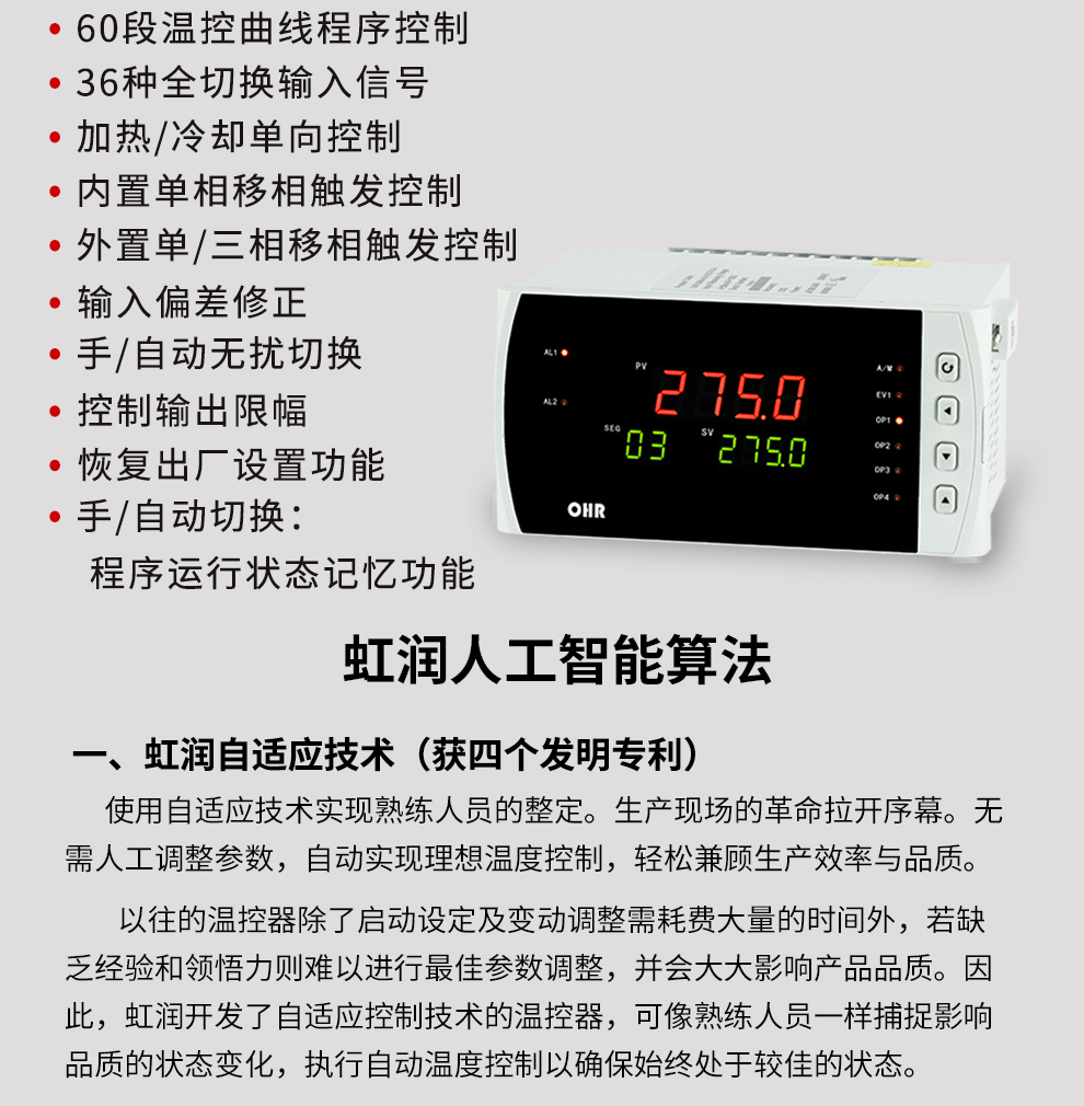 虹潤公司是專業(yè)生產(chǎn)溫控器的國家專精特新“小巨人”企業(yè)。生產(chǎn)的程序段智能溫控器,具有真正人工智能算式,無需人工整定參數(shù),控制精度可達(dá)±0.1°C,60段溫控曲線程序,無超調(diào)、欠調(diào)等特點。產(chǎn)品獲得模糊PID控制儀及控制方法、人工智能調(diào)節(jié)器、智能化控制器、移相觸發(fā)控制器、閥門自動手動無擾動操作控制方法及裝置等5項國家發(fā)明專利,主持起草智能溫度儀表通用技術(shù)條件、工業(yè)過程控制系統(tǒng)用模擬輸入兩位或多位輸出儀表、工業(yè)過程測量和控制系統(tǒng)用智能調(diào)節(jié)器等3項國家標(biāo)準(zhǔn),,以及通信系統(tǒng)多通道數(shù)據(jù)采集控制終端規(guī)范軍用標(biāo)準(zhǔn),參與國際5G標(biāo)準(zhǔn)制定,取得60段PID自整定調(diào)節(jié)器等3項相關(guān)軟件著作權(quán)。產(chǎn)品廣泛應(yīng)用于電力、石化,冶金、制藥、食品等幾乎所有工業(yè)現(xiàn)場,實現(xiàn)精準(zhǔn)控溫,保障生產(chǎn)安全與質(zhì)量。