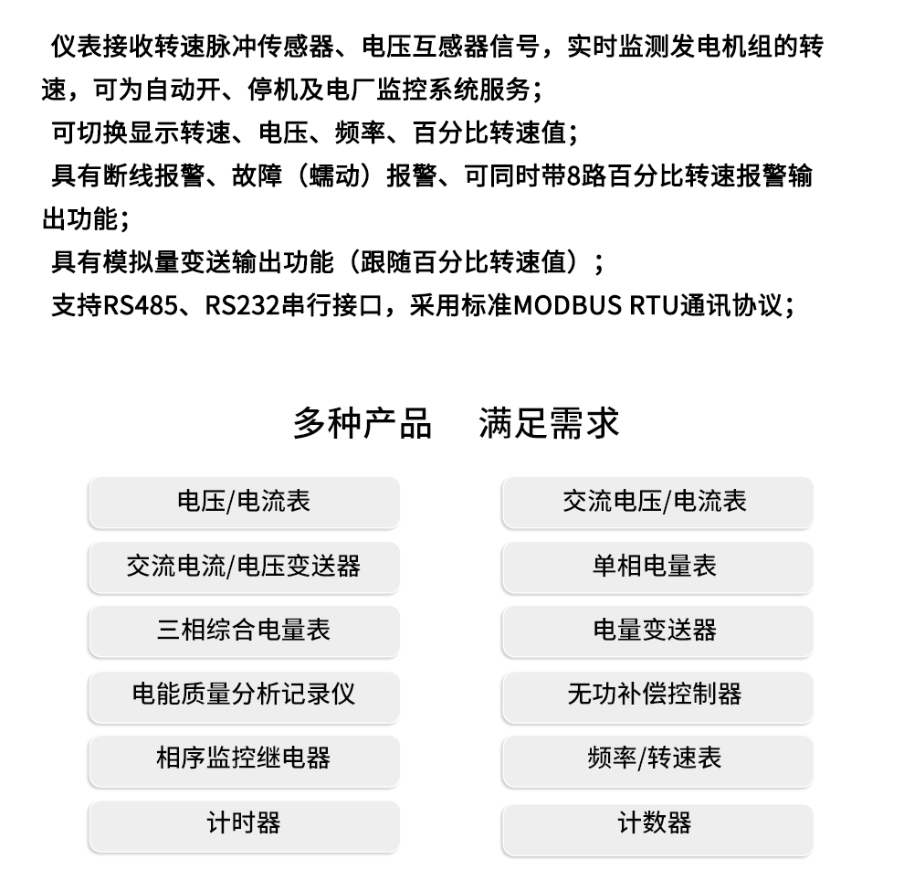 電量儀表與變送器 電壓/電流表 電能質量分析記錄儀 交流電壓電流表 單相電量表 三相綜合電量表 交直流電流電壓變送器 電量變送器 漏電流變送器 電壓電流越限報警器 無功補償控制器 相序監控繼電器 頻率與轉速表 定時器 計時器 計數器 電廠專用轉速表