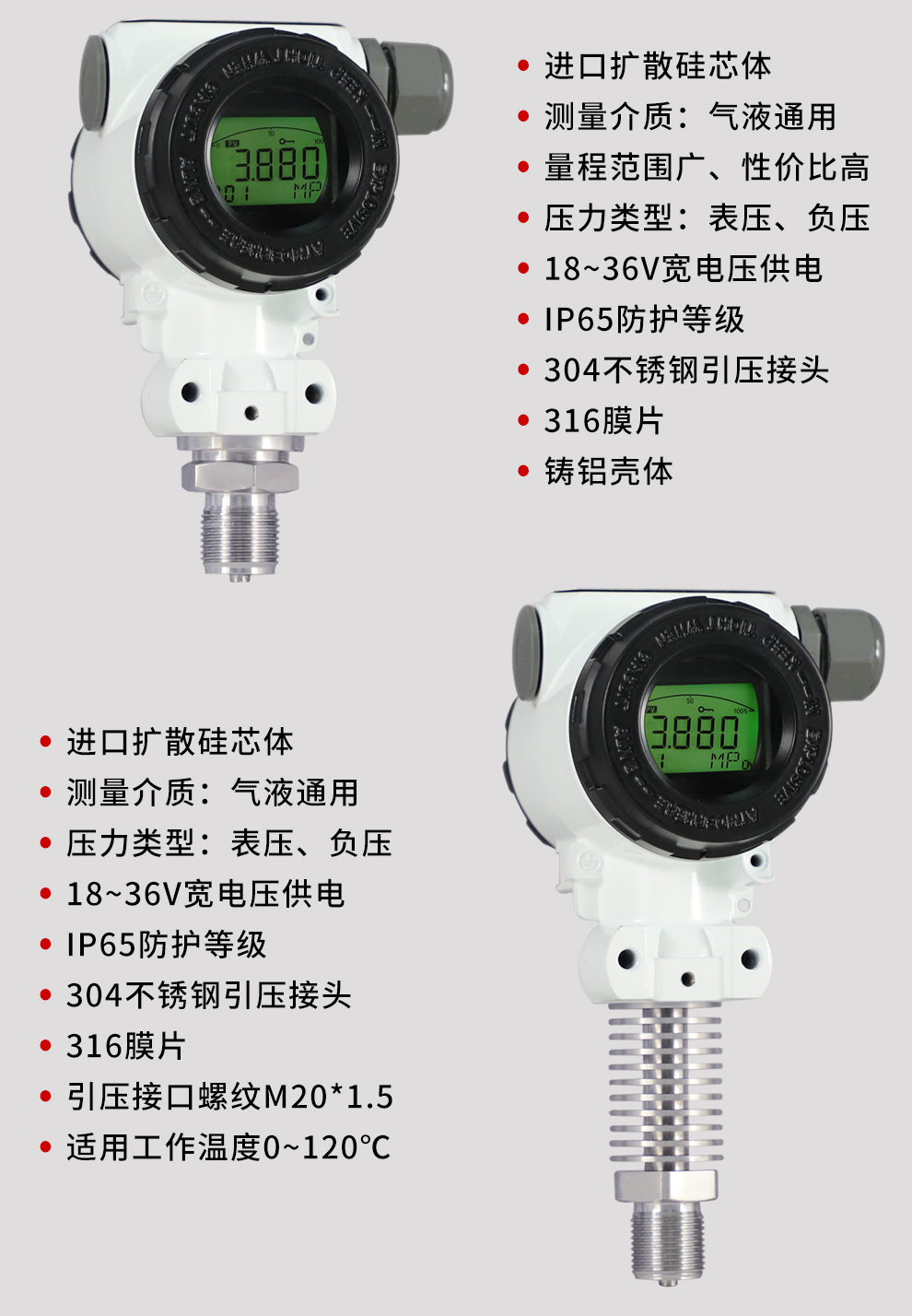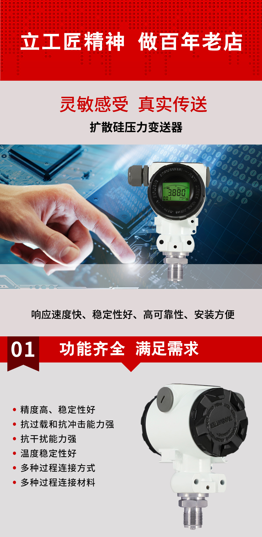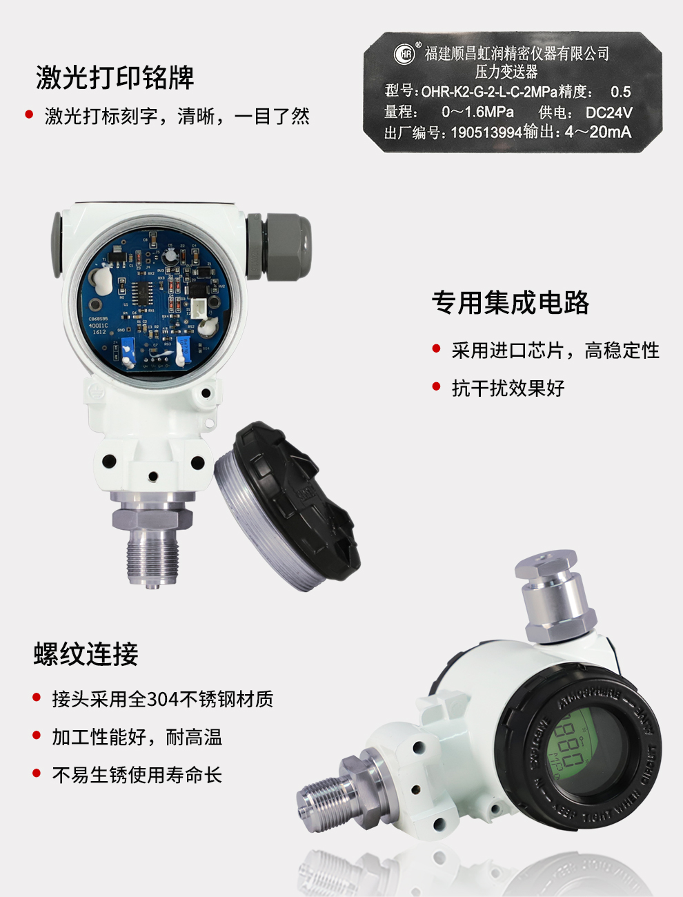 虹潤公司是專業生產壓力變送器的國家專精特新“小巨人”企業,生產的擴散硅壓力變送器,具有精度高,穩定性好,響應速度快,高可靠性,抗過載和抗沖擊能力強,安裝方便等特點。產品獲得一種數字顯示低功耗壓力表、一種信號發生器裝置等2項國家發明專利,主持起草工業過程控制系統用模擬輸入兩位或多位輸出儀表、工業過程測量和控制系統用壓力/差壓變送器等2項國家標準,通信系統多通道數據采集控制終端規范軍用標準,以及現場設備集成等5項智能制造國家標準。參與國際5G標準制定,取得數顯壓力表等2項相關軟件著作權。產品廣泛應用于化工、食品、制藥、電力、設備配套、供暖、水處理、樓宇等行業,需精準測量流體壓力的現場。