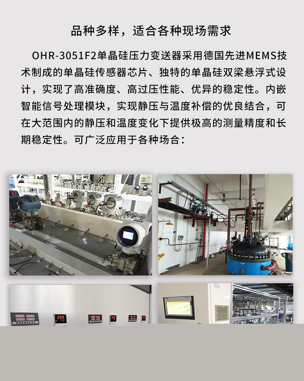 虹潤公司是專業生產壓力變送器的國家專精特新“小巨人”企業,生產的單晶硅壓力變送器,具有高精度,小溫漂,性能穩定,帶HART通訊,抗干擾能力強,自診斷功能等特點。產品獲得一種數字顯示低功耗壓力表、一種信號發生器裝置等2項國家發明專利,主持起草工業過程控制系統用模擬輸入兩位或多位輸出儀表、工業過程測量和控制系統用壓力/差壓變送器等2項國家標準,通信系統多通道數據采集控制終端規范軍用標準,以及現場設備集成等5項智能制造國家標準。參與國際5G標準制定,取得數顯壓力表等2項相關軟件著作權。產品廣泛應用于化工、食品、制藥、電力、設備配套、供暖、水處理、樓宇等行業,需精準測量流體壓力的現場。
