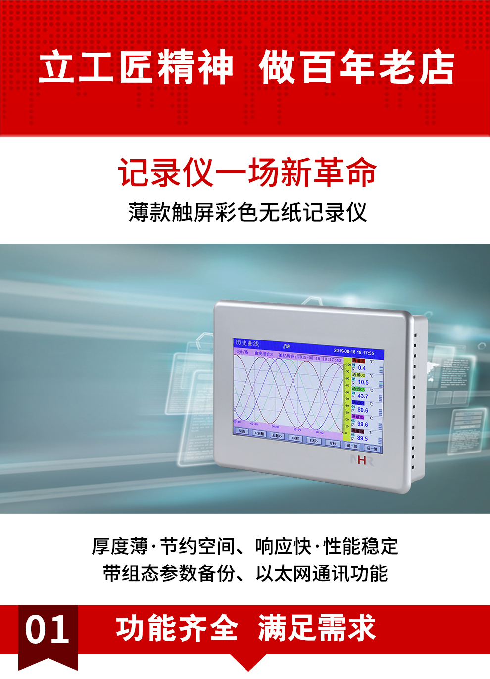 虹潤公司是專業生產無紙記錄儀的國家專精特新“小巨人”企業。生產的觸摸屏無紙記錄儀,具有觸摸大屏顯示,多通道全切換輸入,數據記錄與轉存, RS485/以太網通訊,5/7/9英寸可選等特點。產品獲得一種無紙記錄儀、數據采集控制工作站、智能化控制器、巡回檢測顯示方法及裝置等4項國家發明專利,主持起草物聯網智能記錄儀表通用技術條件、物聯網智能溫度儀表通用技術條件等2項國家標準,通信系統多通道數據采集控制終端規范軍用標準,以及空間數據與信息數據傳輸系統等2項航天標準,參與國際5G標準制定,取得觸摸屏彩色無紙記錄儀等4項相關軟件著作權。產品廣泛應用于冶金、石化、電力、制藥、新能源、現代農業、生產過程等諸多領域。