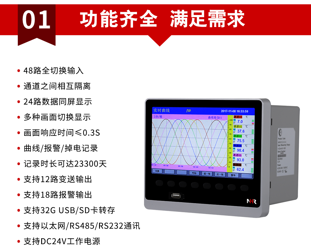 虹潤公司是專業生產無紙記錄儀的國家專精特新“小巨人”企業。生產的48路彩色無紙記錄儀,具有48路全切換輸入,數據記錄與轉存功能,配套上位機管理軟件,RS485/以太網通訊等特點。產品獲得無紙記錄儀、數據采集控制工作站、智能化控制器、巡回檢測顯示方法及裝置等4項國家發明專利;主持起草物聯網智能記錄儀表通用技術條件、物聯網智能溫度儀表通用技術條件等2項國家標準,通信系統多通道數據采集控制終端規范軍用標準,以及空間數據與信息數據傳輸系統等2項航天標準,參與國際5G標準制定;取得彩色無紙記錄儀等4項相關軟件著作權。產品廣泛應用于石化、冶金、電力、制藥、新能源、農業等諸多領域。