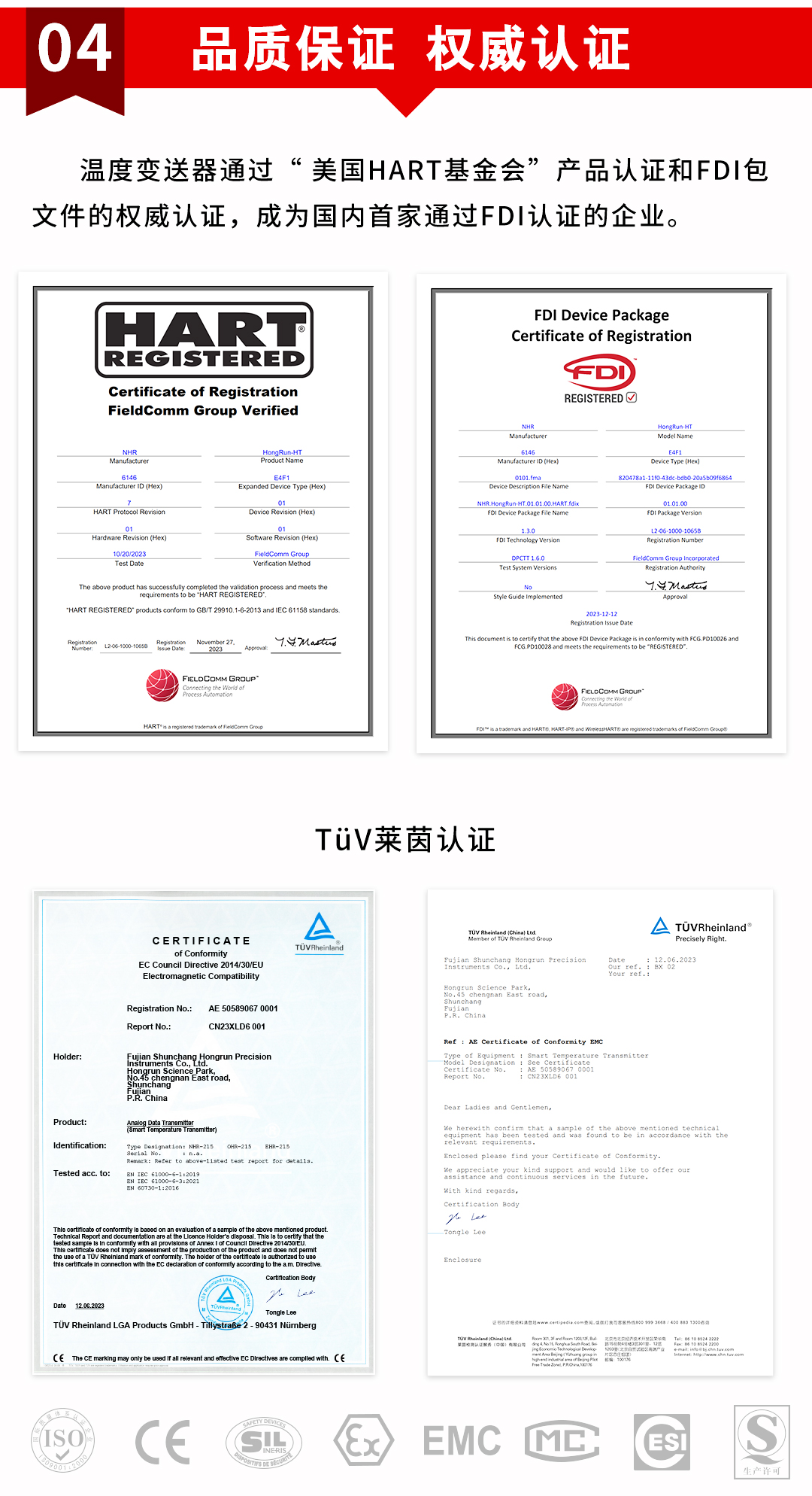 虹潤公司是專業生產溫度變送器的國家專精特新“小巨人”企業。生產的智能溫度變送器,具有適配各類溫度傳感器,精度高,通過編程線修改輸入信號類型及量程,高抗干擾,HART或485通訊等特點。該產品不僅通過HART基金會認證、德國萊茵 CE 認證與 SIL 功能安全認證,還獲得具備減震抗干擾能力的溫度變送器、信號隔離器、一種二端子模塊、無源信號隔離器等4項國家發明專利,主持起草物聯網智能溫度儀表、現場設備工具(FDT)接口規范、工業過程測量和控制系統用溫度變送器等3項國家標準,以及通信系統多通道數據采集控制終端規范軍用標準,參與國際5G標準制定,取得HART溫度變送器、智能溫度變送器等3項相關軟件著作權。產品廣泛應用于石油、化工、電力、冶金、制藥、食品、水處理等各種工業領域。