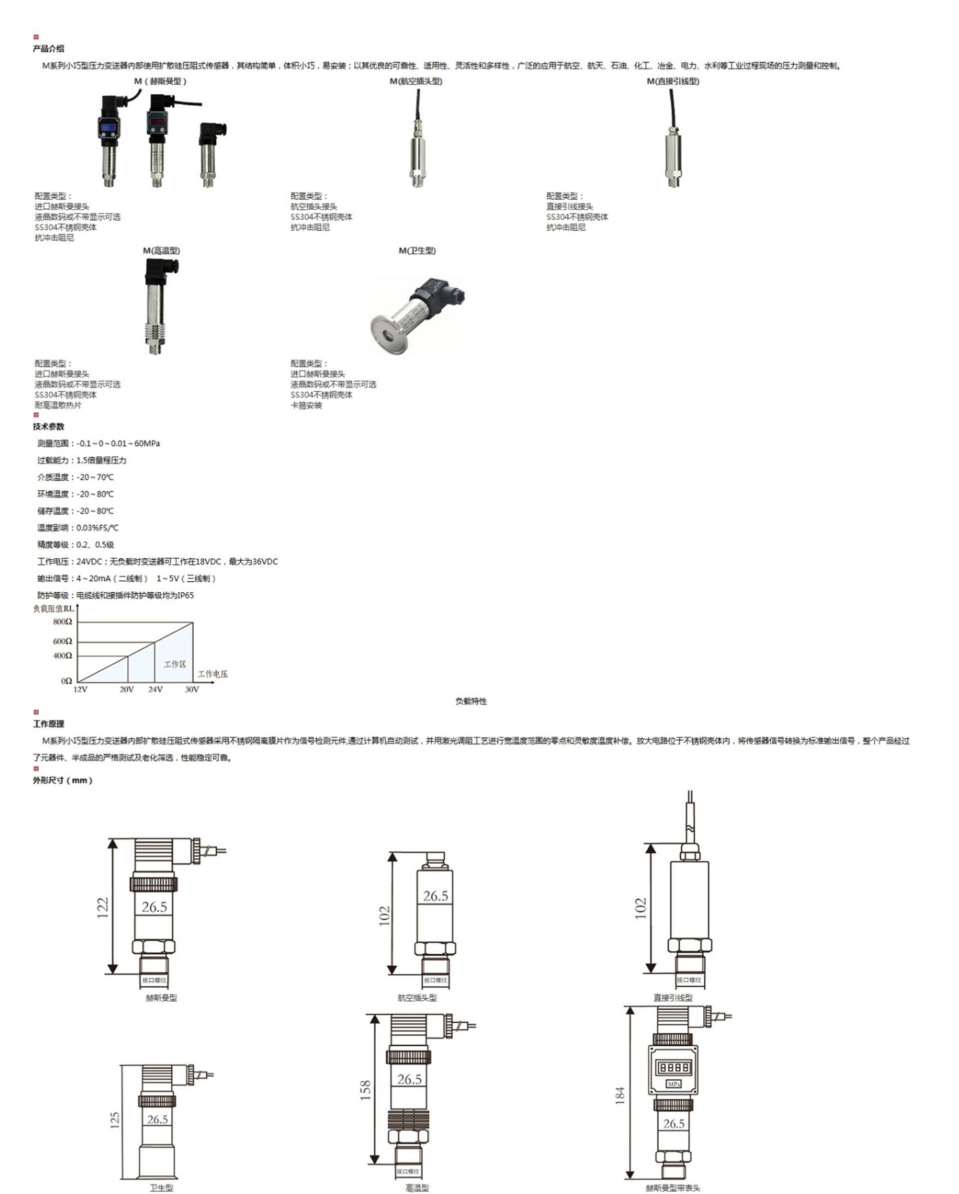 M系列小巧型壓力變送器內部使用擴散硅壓阻式傳感器,其結構簡單,體積小巧,易安裝;以其優良的可靠性、適用性、靈活性和多樣性,廣泛的應用于航空、航天、石油、化工、冶金、電力、水利等工業過程現場的壓力測量和控制。