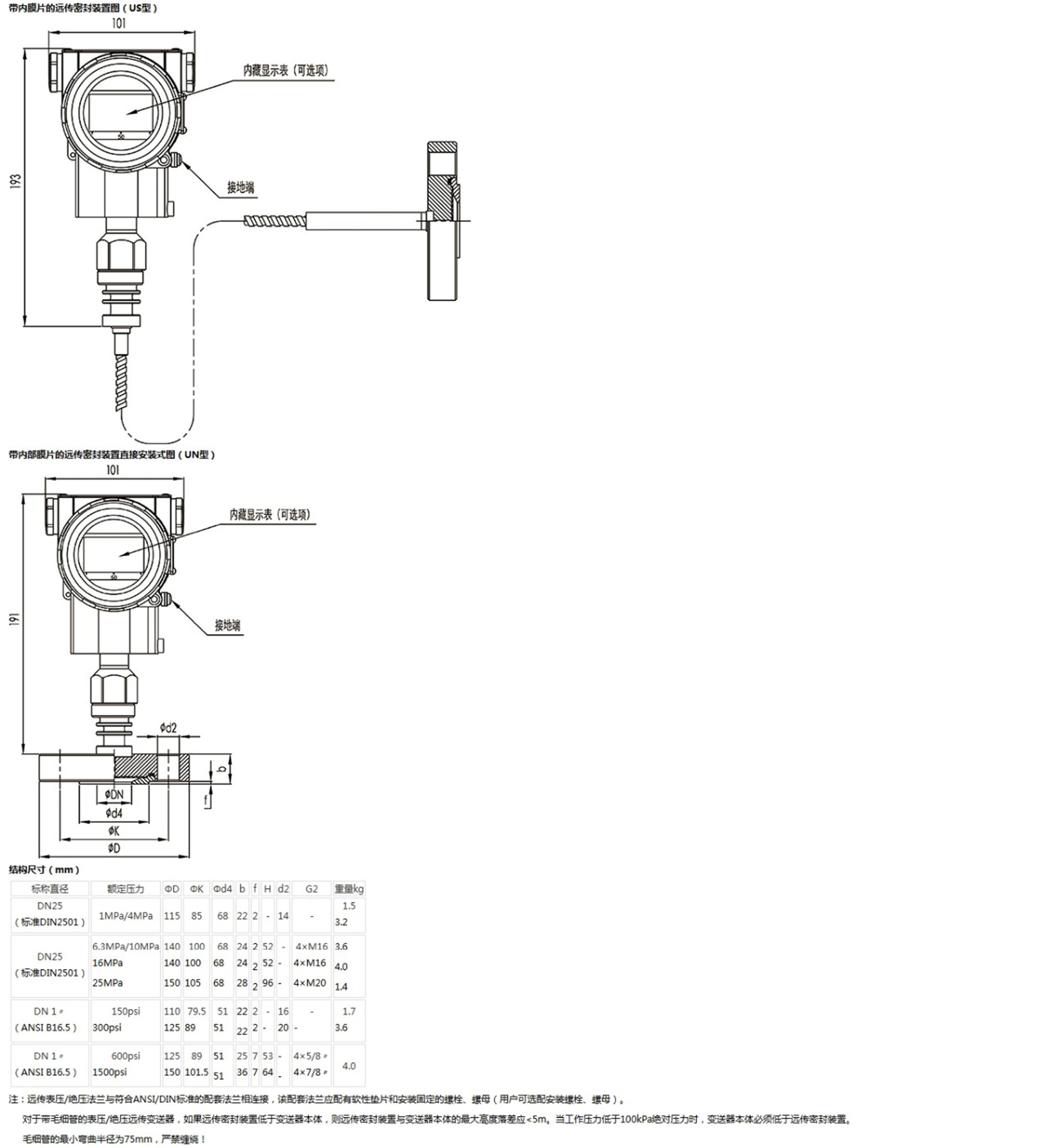 該產品用于測量液體、氣體或蒸汽的液位、密度、壓力,將其轉變成4~20mA (HART)電流輸出信號,可通過RST375手持終端對它們進行參數設定、過程監控等。測量范圍(未遷移時)為0-6kPa~25MPa,液位法蘭的額定壓力分別為:1.6/4MPa、6.4MPa、10MPa、150psi、300psi或600psi。